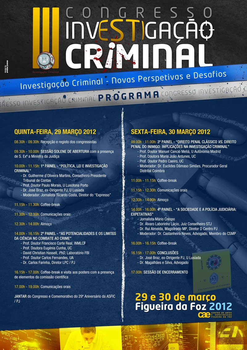 O 3º Congresso de Investigação Criminal” sob o lema Investigação Criminal – Novas Perspetivas e Desafios” terá lugar na Figueira da Foz nos dias 29 e 30 de março de 2012. Este Congresso é uma iniciativa conjunta da Associação Sindical dos Funcionários de Investigação Criminal da Polícia Judiciária (ASFIC / PJ) e da Universidade de Coimbra.