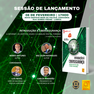 Sessão de apresentação do livro “Introdução à cibersegurança – A internet, os aspetos legais e a análise digital forense”, 2.ª edição atualizada, da autoria de Mário Antunes e Baltazar Rodrigues, dia 8 de fevereiro, no Auditório 1 da Sede da Polícia Judiciária.