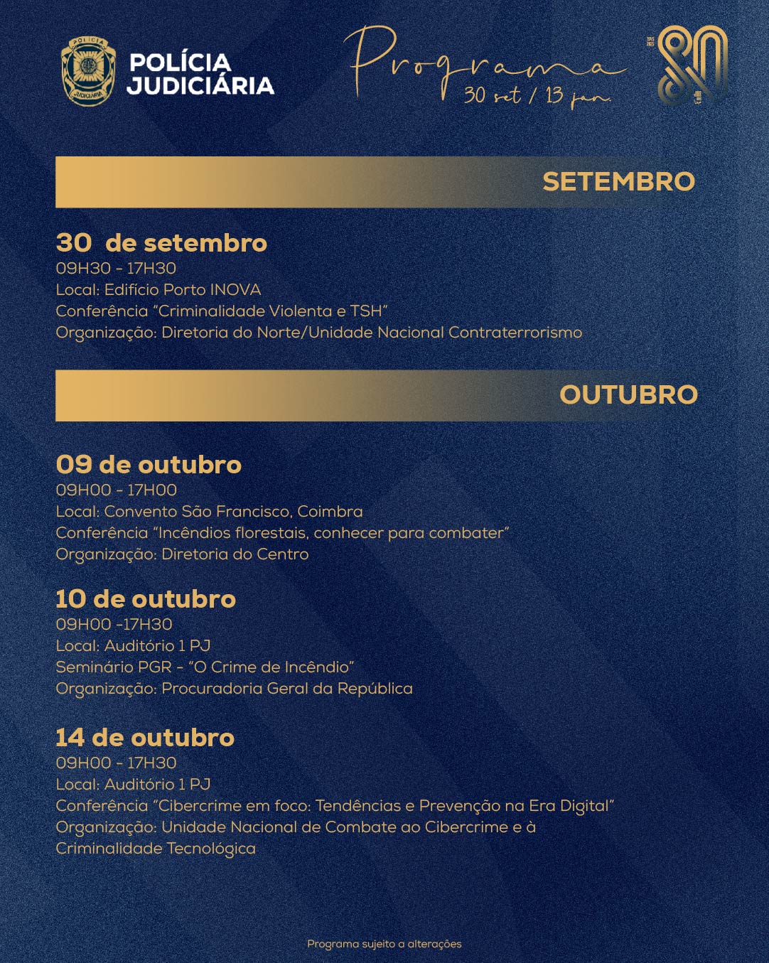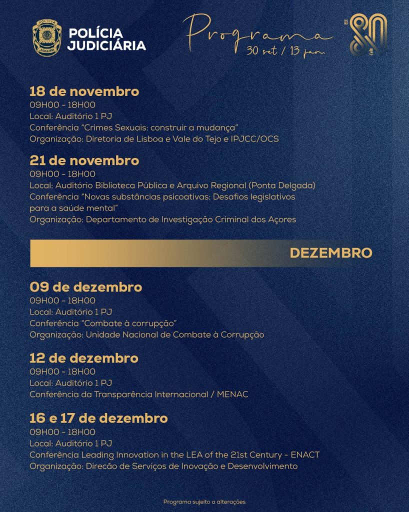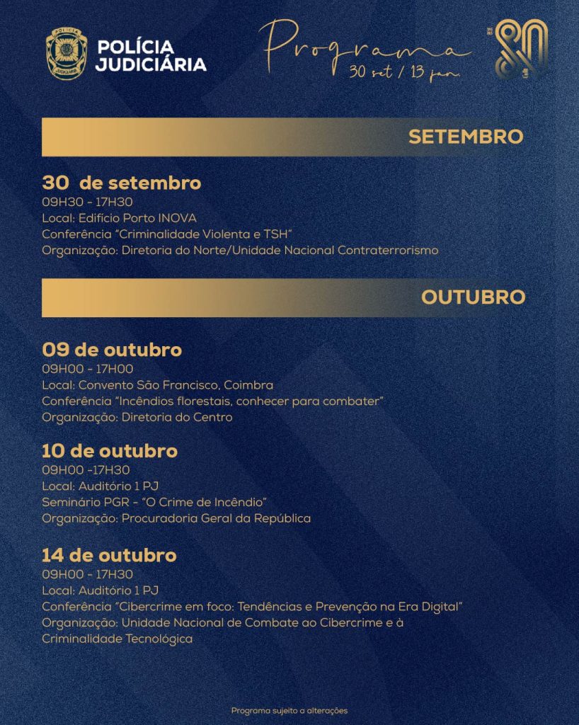 A primeira conferência “Criminalidade Violenta, Tráfico de Pessoas e Auxílio à Imigração Ilegal”, realizada no Porto, a 30 de setembro, marcou o arranque do ciclo comemorativo dos 80 anos da Polícia Judiciária. Conheça aqui o programa completo ⇓